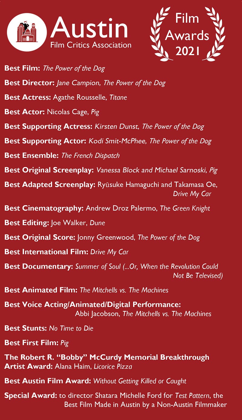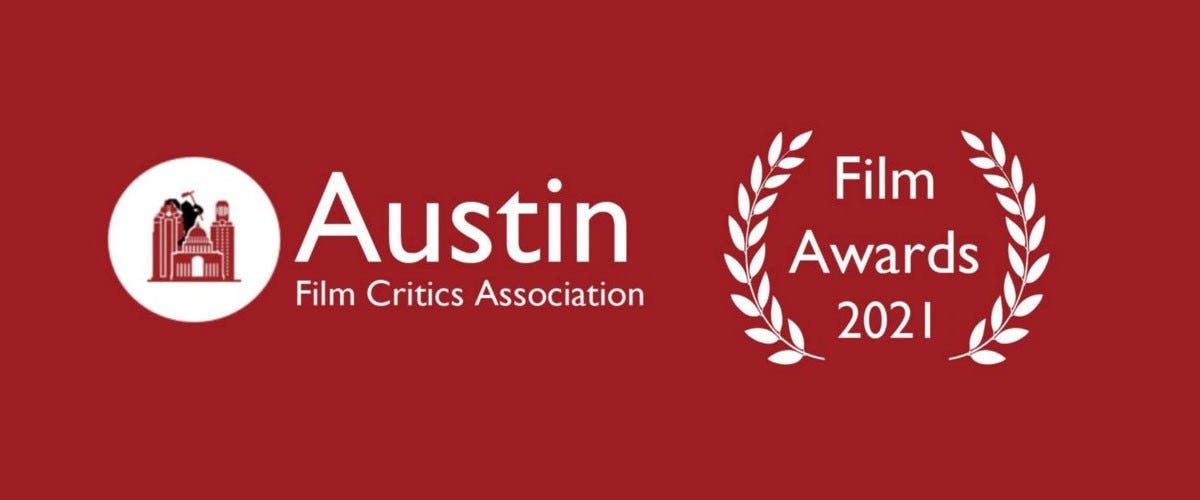 The Austin Film Critics Association (AFCA) announced its 2021 awards, with The Power of the Dog leading the way, winning 5 awards from its 9 nominations.