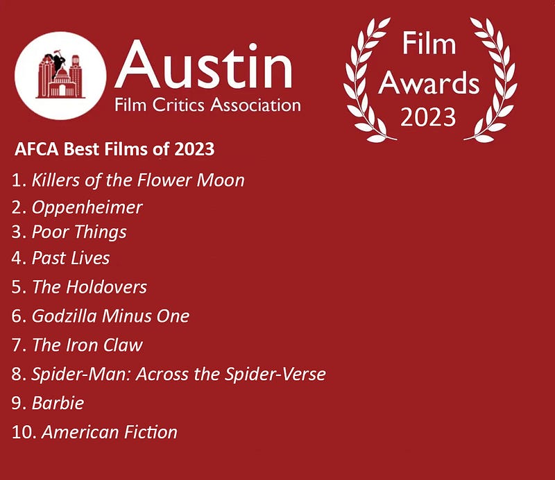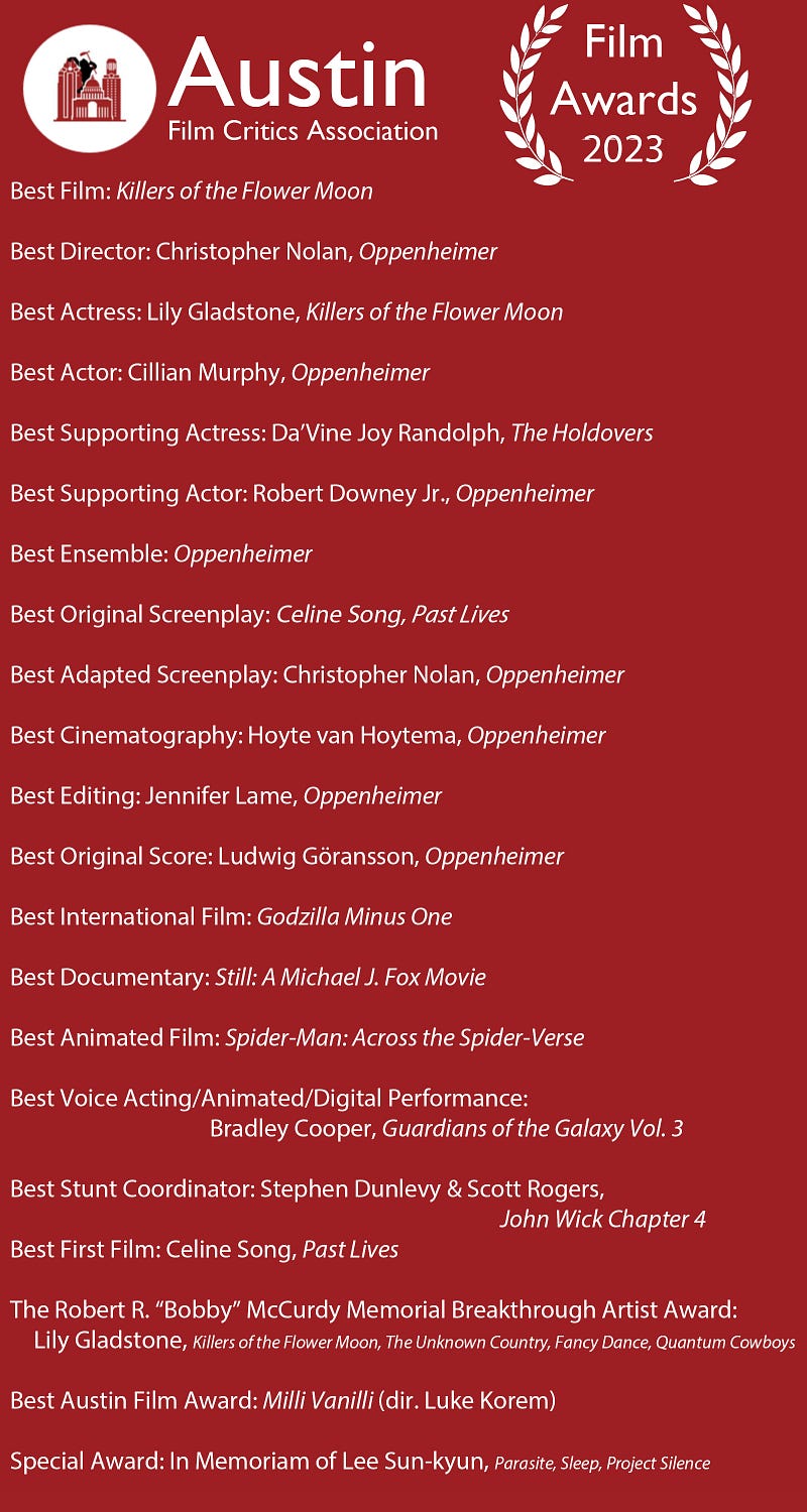 The full list of winners, including the AFCA Best Austin Film and AFCA Top Ten Films of 2023, is included below.